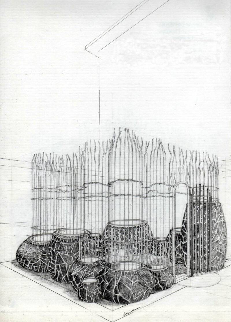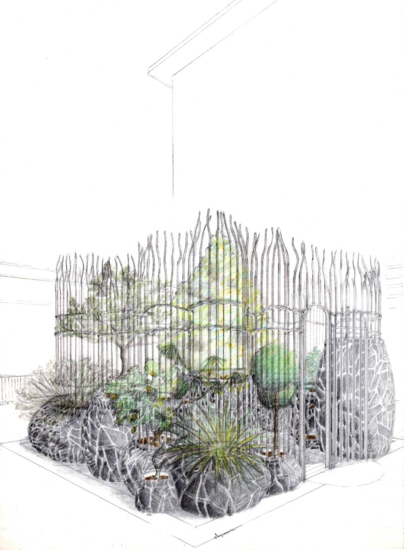 Le périmètre du patio est délimité par des pots en céramique utilisant la technique du raku.