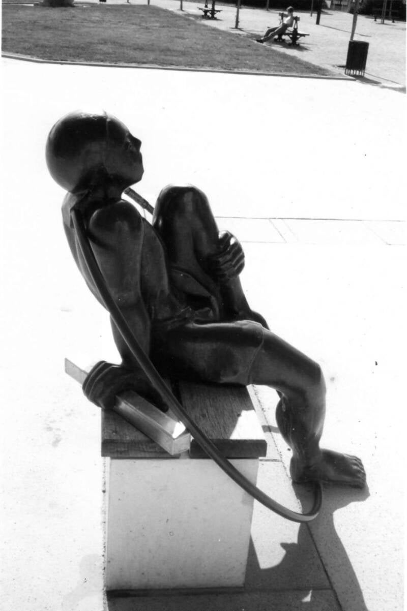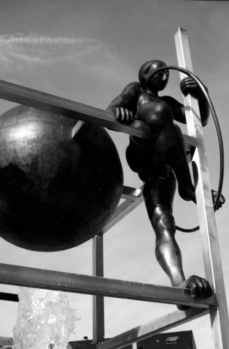 Deux personnages, un homme et une femme, assemblent les éléments d’une cage. Cette cage doit leur permettre d’atteindre la lune, sphère métallique semblant être portée par des jets d’eau. Un peu à l’écart, un enfant, assis sur un banc, les observe. Les trois personnages portent des cerceaux supposés les aider dans leur capture.