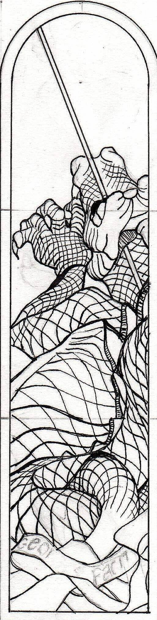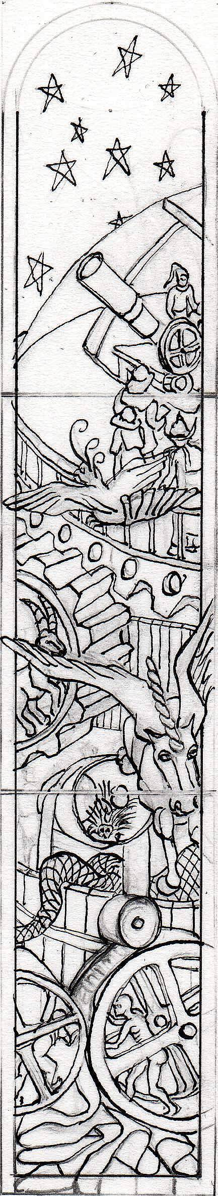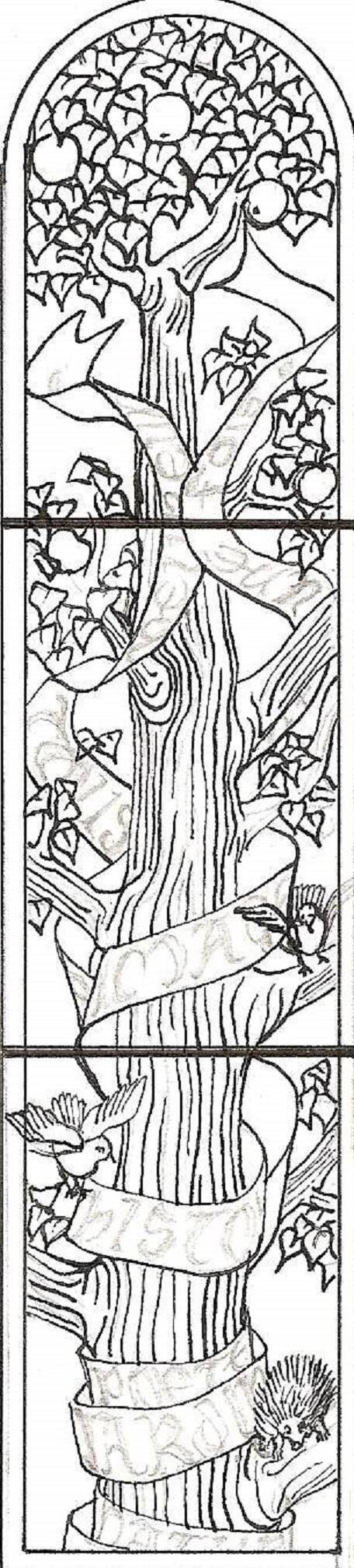 Chaque fenêtre, qui raconte un épisode de la légende, se lit de bas en haut.